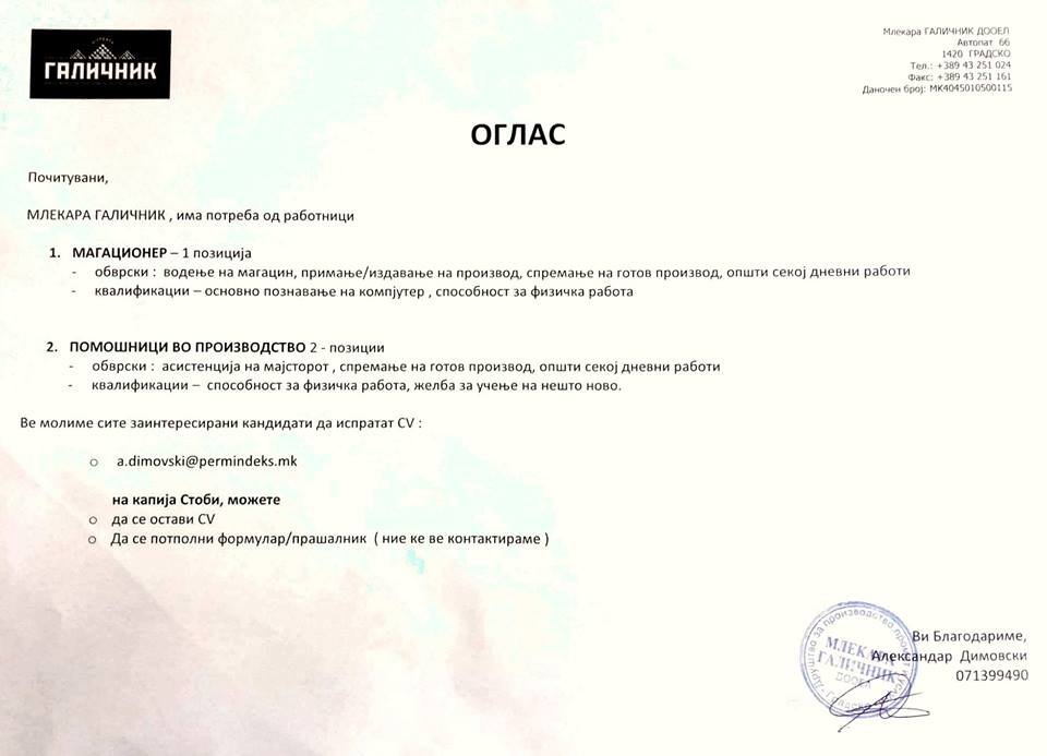 izvestuvanje oglas za rabota